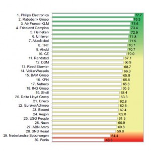 Van de financiële dienstverleners was de reputatie van Fortis het meest drastisch gedaald. Fortis is dan ook de hekkensluiter van deze Nederlandse ranglijst. Ook ABN Amro en ING zijn laag geëindigd. In deze onderzoeken worden de reputaties van de grootste (omzet) Nederlandse organisaties bekeken. Welke een significante consumenten zichtbaarheid hebben en minimaal een bekendheid hebben bij de respondenten. Zij konden kiezen uit 4 organisaties waarmee ze bekend waren. DNB kwalificeert zich hier niet, door alle commotie is zij wel negatief zichtbaar geworden. Maar de consumenten bekendheid (ervaring met het merk) is er niet, behoudens na de euro invoering voor het omwisselen van guldens naar euro’s en wellicht binnenkort weer van euro naar mark, gulden of neuro?