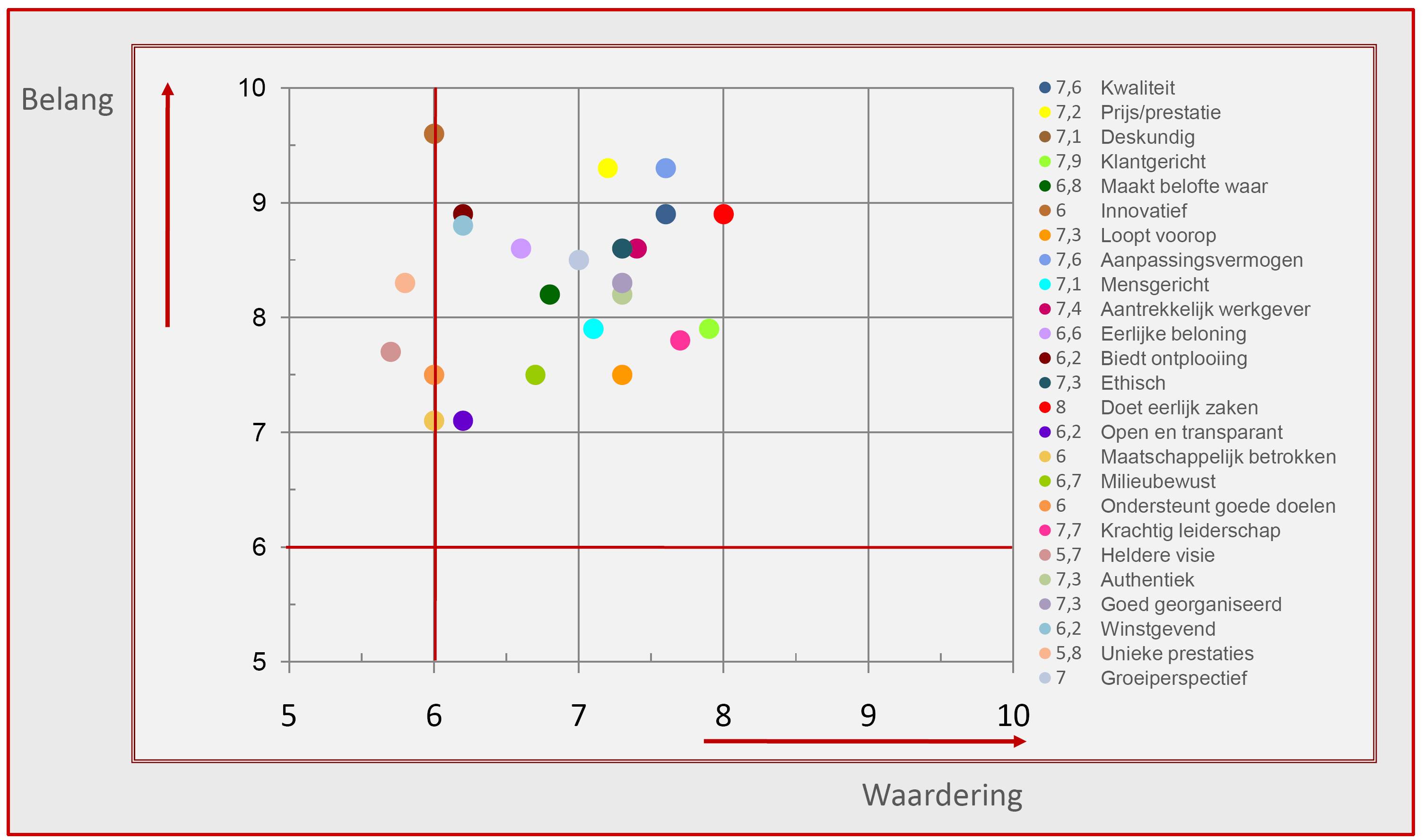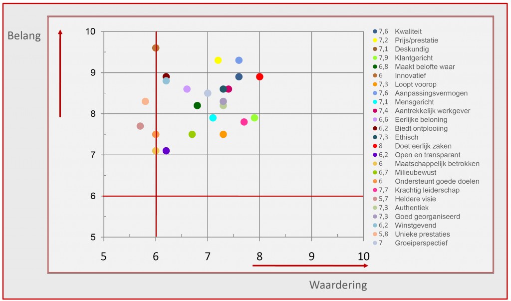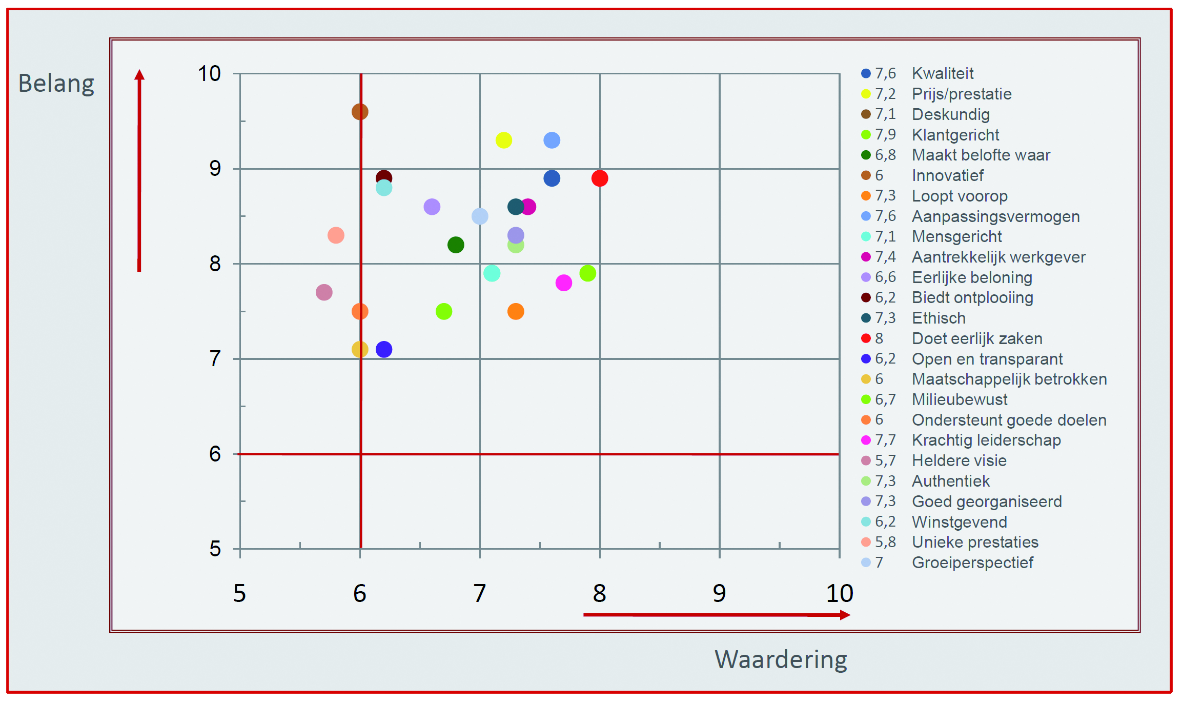 Het externe reputatieonderzoek (reputatiescan) brengt op heldere wijze de beeldvorming bij de voor de organisatie relevante stakeholders in beeld. Tijdens het onderzoek wordt per attribuut naar het belang gevraagd, ofwel hoe belangrijk vindt de stakeholder dat de organisatie veel aandacht aan een bepaald attribuut besteedt. (zie figuur 4)