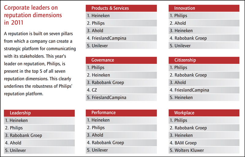 Figuur2. Reputation drivers en nationale scores (Reputation Intitute 2011)