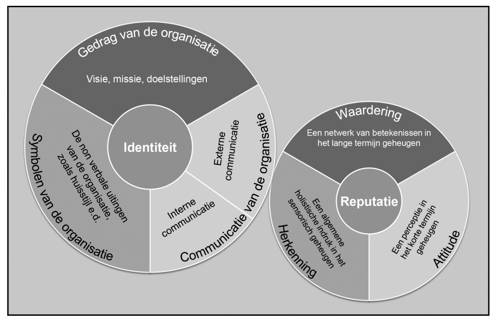 De identiteit is het wezenlijk ‘ik’ van de organisatie. Het zijn de symbolen, de communicatie en het gedrag die daarmee de merkpersoonlijkheid vormen. De merkidentiteit is de kern voor het imago (zie figuur 1) en de reputatie. Het grensvlak tussen imago en reputatie is marginaal. Waar imago vaak over de globale beeldvorming gaat, heeft reputatie meer te maken met vertrouwen op basis van het gedrag van de organisatie. Bouwen aan een merkpersoonlijkheid die doelbewust gericht is op MVO is primair bouwen aan het gedrag van de organisatie. Immers de organisatie moet waarmaken wat zij belooft en dat gaat verder dan communiceren.
