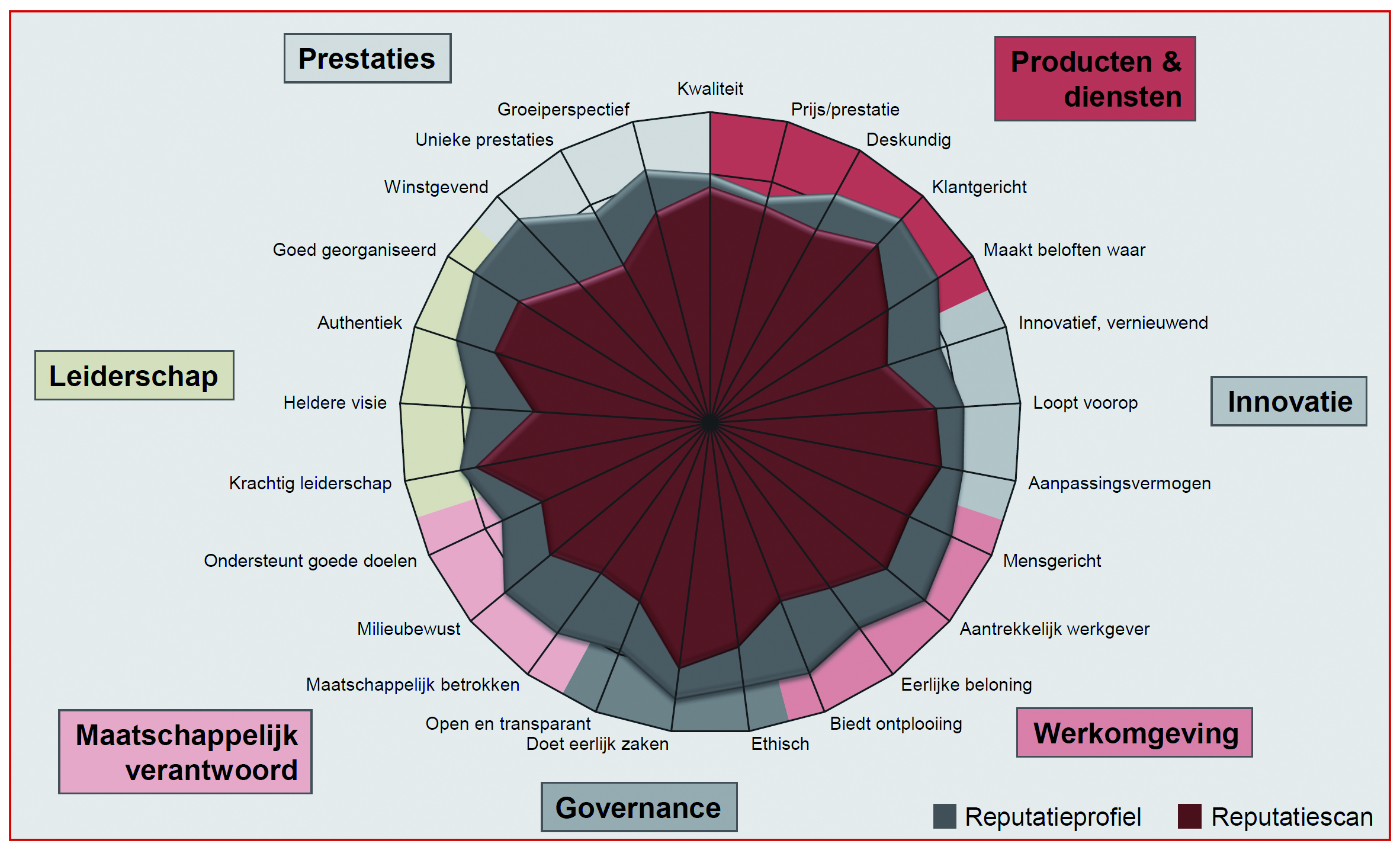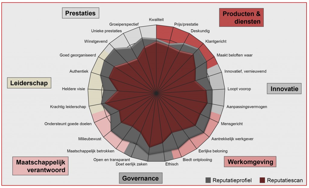 Aan de hand van dit model wordt er, voorafgaande aan het onderzoek, een gewenst reputatieprofiel vastgesteld. Het reputatieprofiel geeft in essentie aan in welke mate de organisatie op de verschillende attributen beoordeeld wil worden. Het is een intern gewenst waardeoordeel door de externe stakeholders.