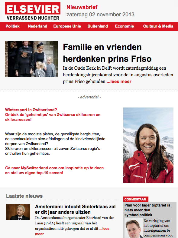De advertentie mogelijkheden op websites in en digitale nieuwsbrieven, kunnen gemakkelijk online door bijvoorbeeld de ‘key words’ veilingsystemen worden ingekocht. Plaatsing van de advertentie gebeurt geheel automatisch zonder tussenkomst van mensen en controle. Nieuwsbrieven worden vaak nog wel met de hand opgemaakt. Bij het voorbeeld van Elsevier hieronder is een niet gewenste combinatie ontstaan van content en reclame. Onder het artikel met de kop “Familie en vrienden herdenken prins Friso” staat de advertentie “ontdek de geheimtips van Zwitserse Skileraren en Skileraressen”!